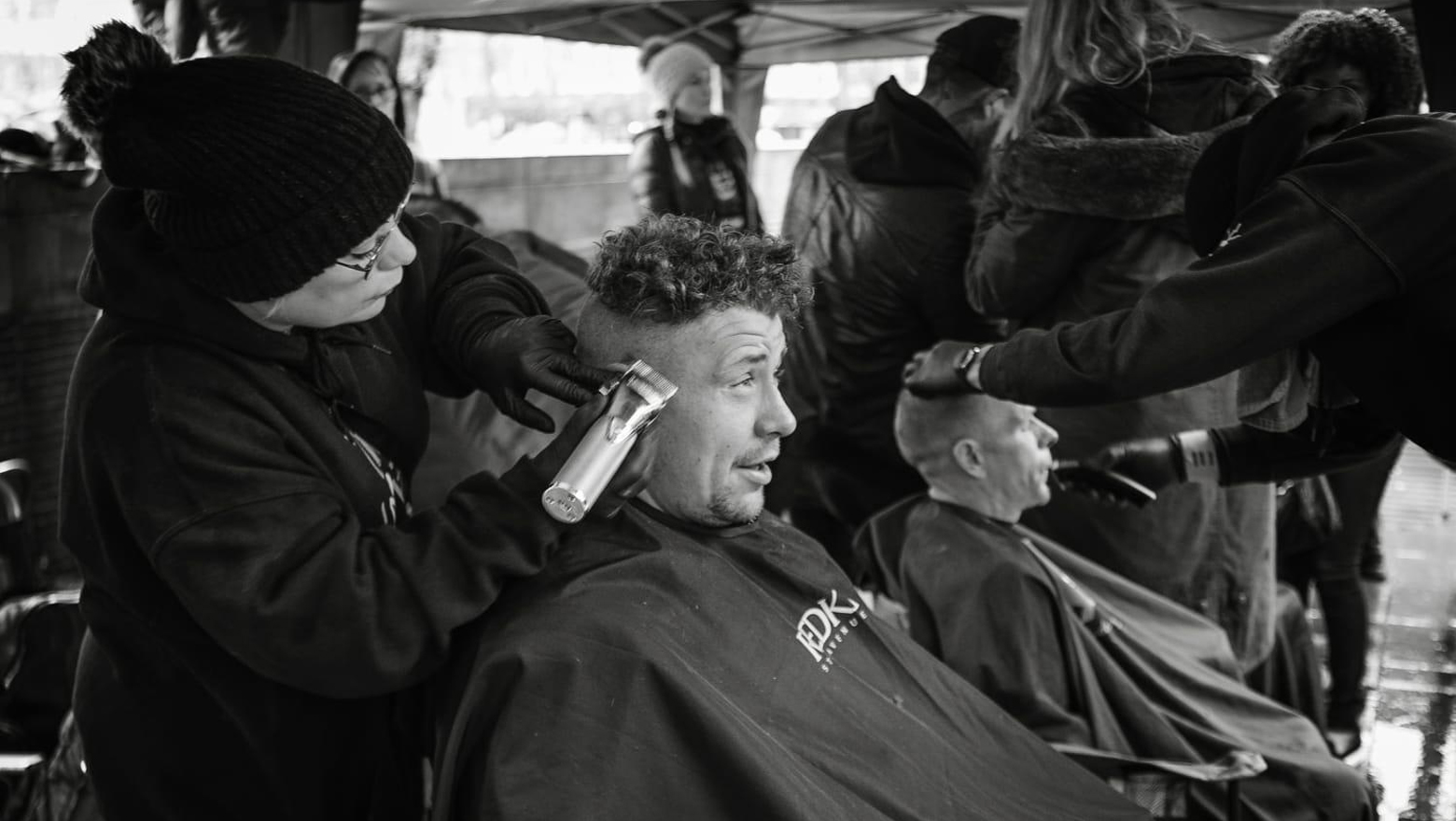 The Christmas event, organised by local barber Ged King, is designed to support the homeless community with a wide variety of services and greatly needed supplies. Ged, made famous by his free haircuts and featured on BBC Three’s “Amazing Humans” series: https://youtu.be/PveLZCyNN4U, took to the streets in 2015 and has since provided over 1,200 haircuts.